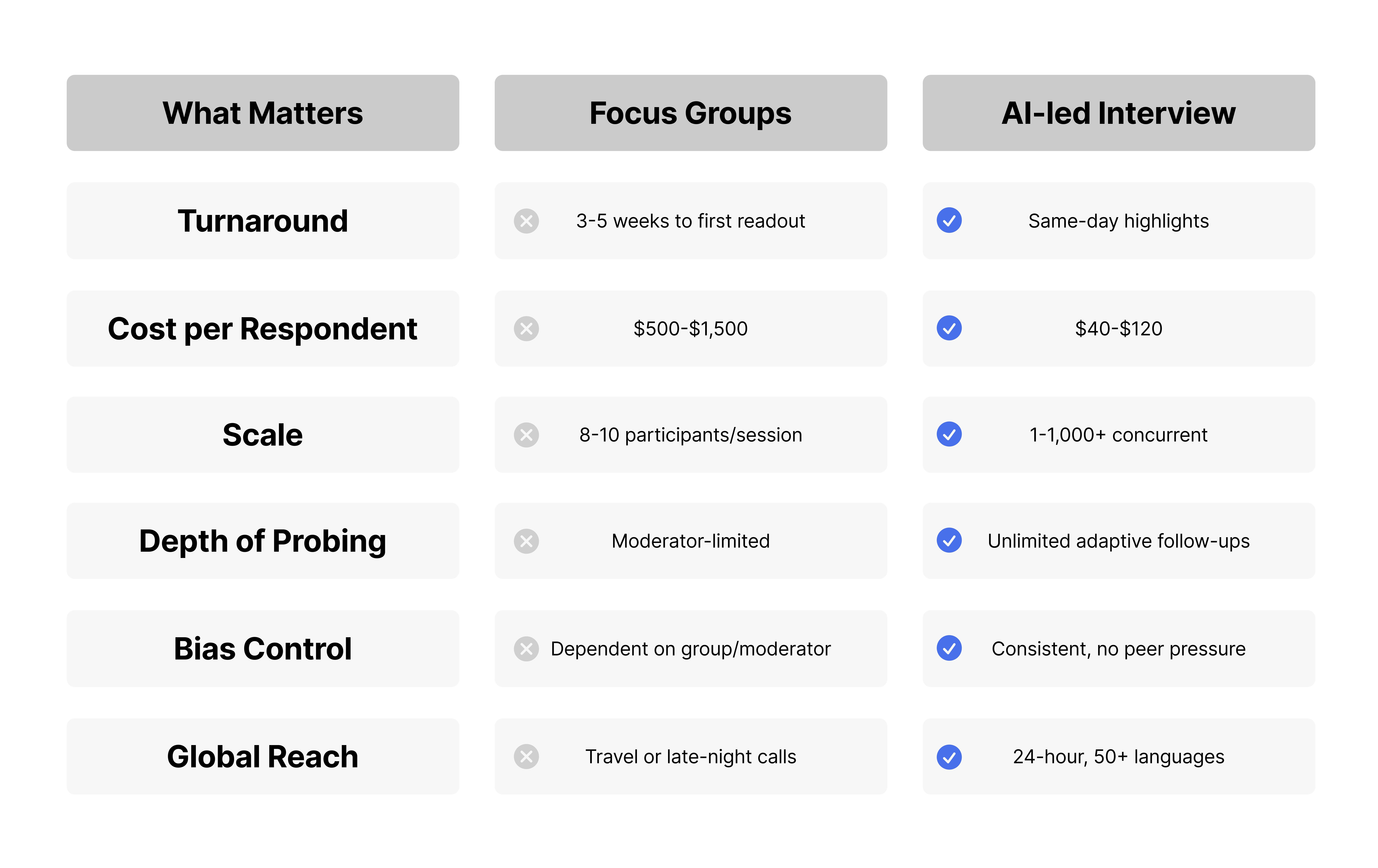 Focus groups still have a place for live co-creation and observed interaction. But for fast, iterative concept testing in 2025, AI-led interviews can deliver deeper candor, greater reach, and quick insights ready to be acted on.
