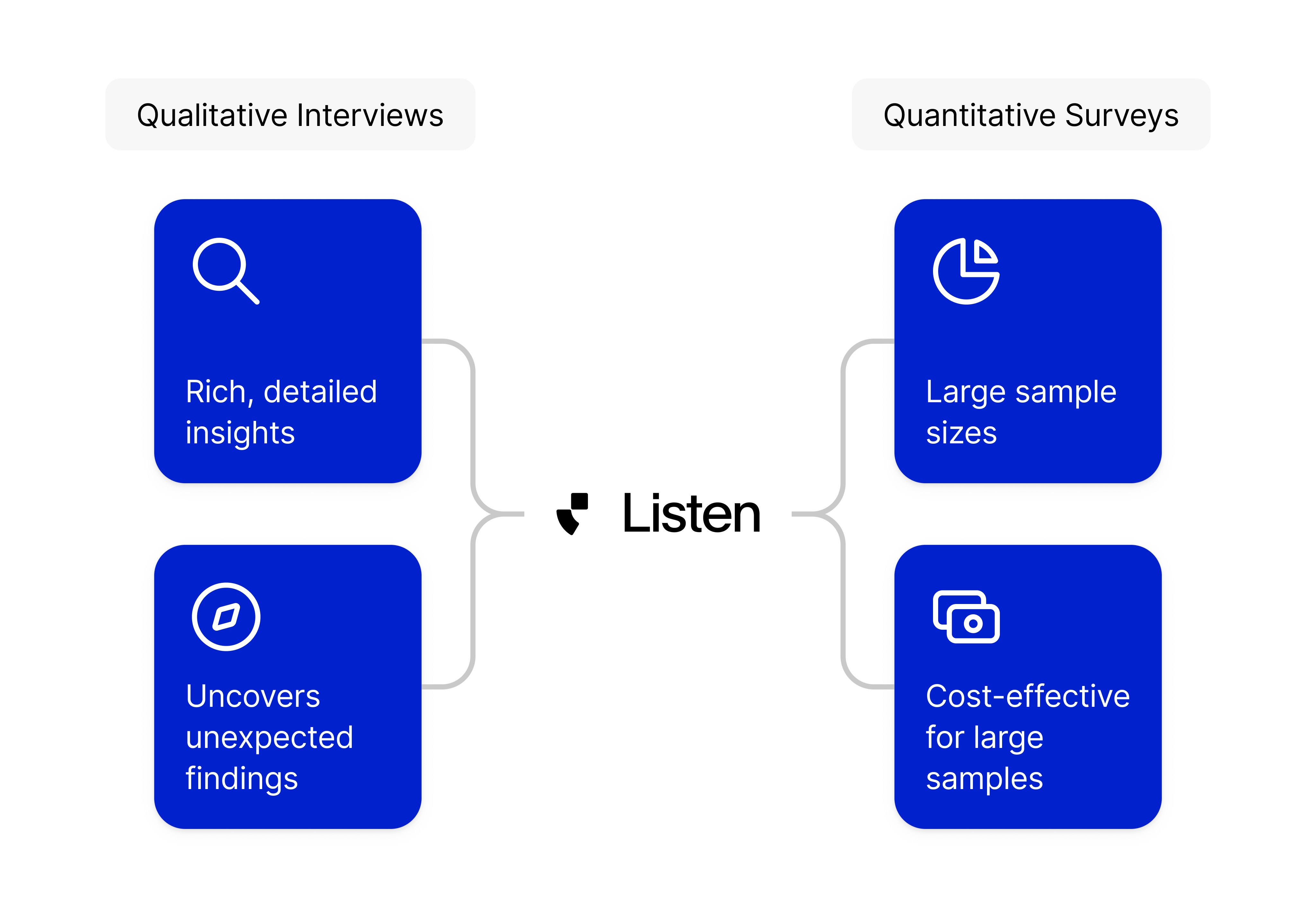 An AI-moderated interview is a one-on-one qualitative session facilitated entirely by conversational AI. The bot asks open-ended questions, listens, then dynamically probes deeper based on each answer — no human facilitator needed.