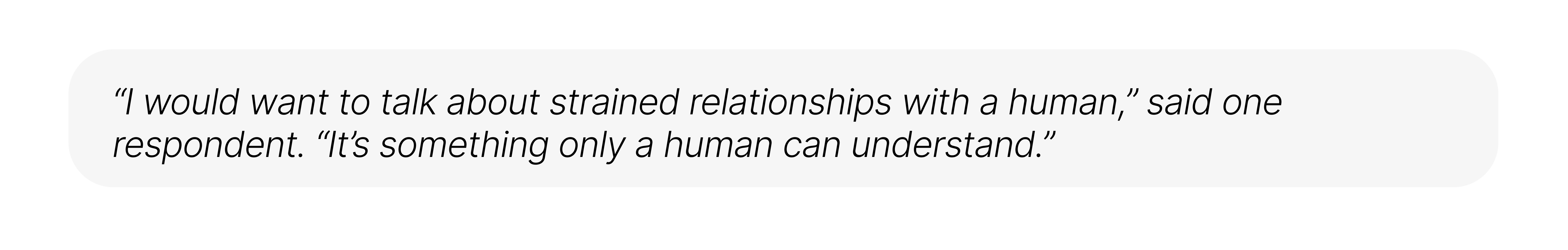 "I would be more open to AI because, like I said earlier, I'm not looking at a human. I'm not seeing their reaction. You know, you're being very vulnerable in these situations. So it's best just to talk about it and go to the next thing, you know, without really having to deal with the personal aspect of it."