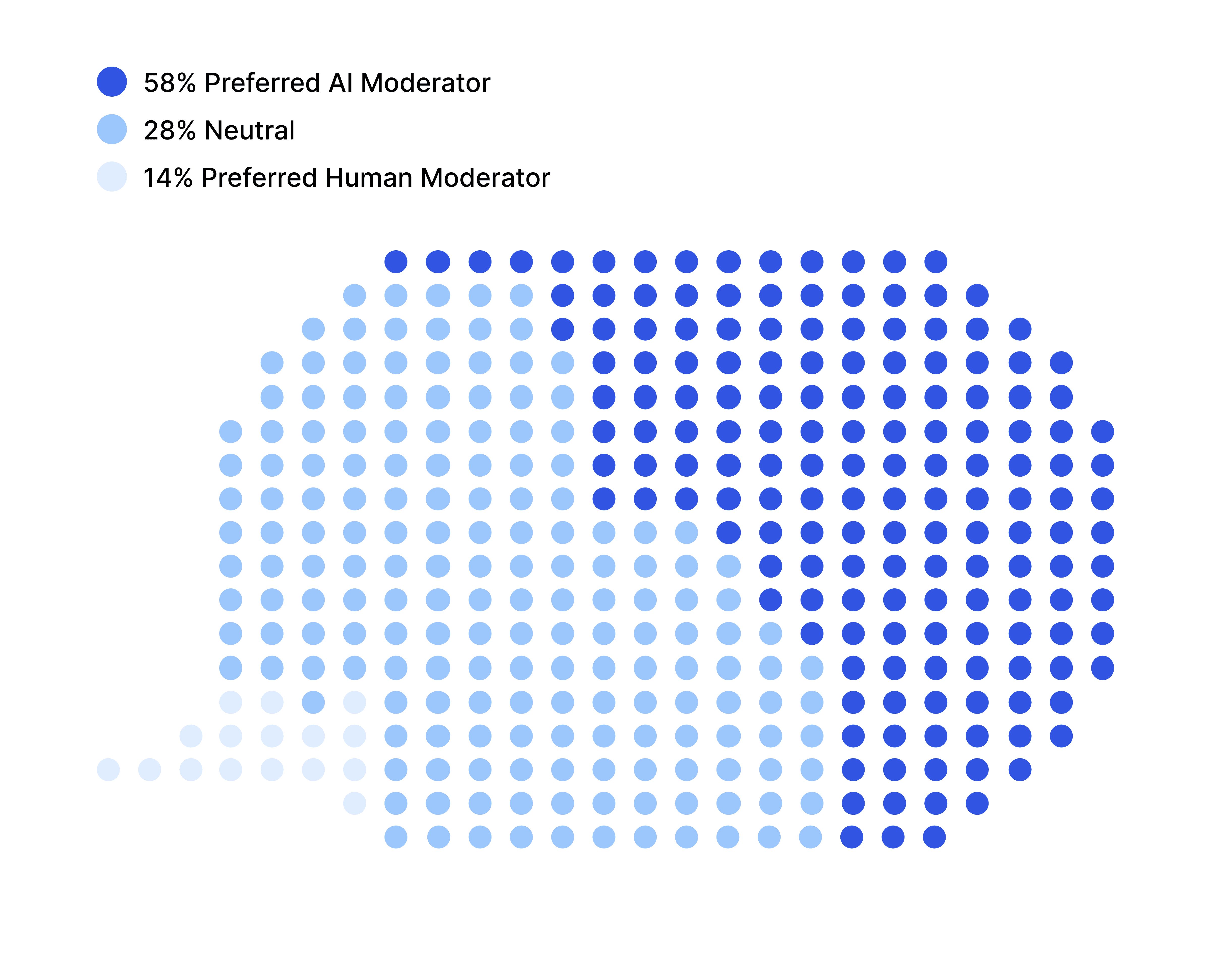 Topic sensitivity drives preference. People gravitate toward AI for private and polarizing topics. Political and religious discussions? 58% prefer AI moderation. Personal finances? Strong AI preference. But for everyday product feedback or shopping habits? Moderation format genuinely doesn't matter. Importantly, while some topics showed less preference for AI compared to others, no topics showed participants preferring humans over AI in our concept test.