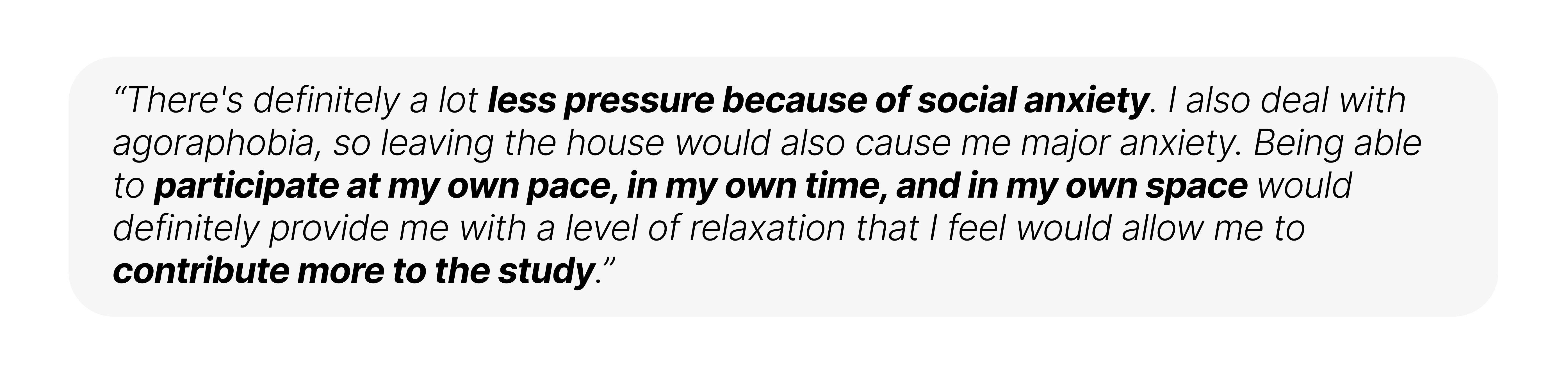 "Scheduled sessions at specific times and locations are much more difficult, especially if I have to travel somewhere, then I have to take time off of work. Being able to do it from my home just makes it easier for me to participate, and I hope that that helps researchers too because they get more data."